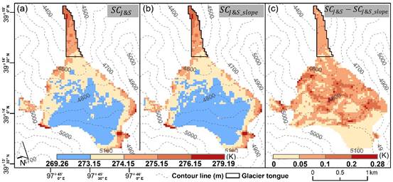 图1 七一冰川消融季考虑周边地形热辐射影响算法(SCJ&S_slope)与不考虑地形影响算法(SCJ&S)的地表温度反演结果对比图