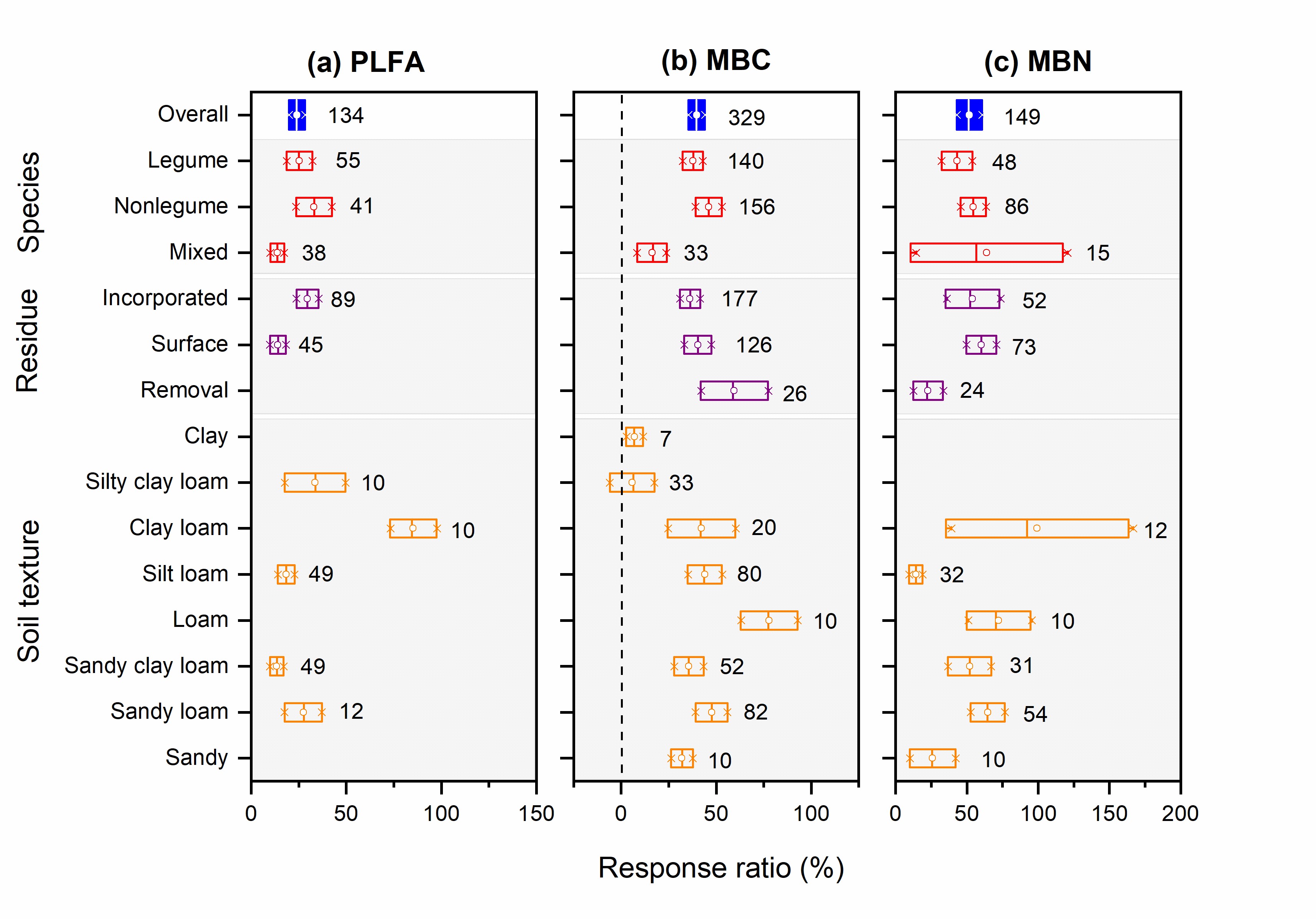在粮食作物生长休闲期间种植填闲作物可以增加地表覆盖和有机物输入、提高土壤质量及后续粮食作物产量,然而关于填闲种植对土壤微生物丰度和群落结构影响的系统性分析未见报道。王俊教授团队筛选了21个国家81项研究成果的1824对数据,利用整合分析方法系统探讨了填闲种植对农田土壤微生物群落丰度和结构的影响。研究发现,与传统的裸地休闲方式相比,填闲种植导致土壤总磷脂脂肪酸(PLFA)、微生物量碳(MBC)、微生物量氮(MBN)分别提高了24%、40%和51%,土壤细菌总数和真菌总数以及其中的类群增加了7-31%,且填闲种植对真菌的影响大于细菌。与单独种植豆科或非豆科填闲作物相比,二者混播显著降低了土壤MBC、PLFA和放线菌数量。而与将填闲作物残余进行表面覆盖或移除相比,将填闲作物残余翻压入土提高了土壤PLFA、细菌总数、丛植菌根定殖和孢子密度,但降低了革兰氏阳性菌和阴性菌以及丛枝菌根数量。土壤微生物对填闲种植的响应与土壤性质和年降水量有关,中等质地土壤中PLFA、细菌、真菌、放线菌数对填闲种植的响应幅度均大于细质和粗质土壤。总体来看,与裸地休闲相比,填闲种植可以通过提高土壤微生物群落丰度、改变群落结构来提高土壤质量。该研究成果受中科院“西部引进人才”项目和国家自然科学基金支持,已在农林学科Top期刊《Geoderma》在线发表。