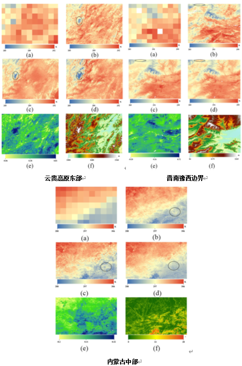 图3 三个研究区逐级降尺度和直接降尺度结果对比。(a) 0.25°的MODIS LST. (b) 原始MODIS LST. (c) 逐级降尺度后的LST. (d) 直接降尺度后的LST. (e) MODIS NDVI. (f) SRTM高程或地形数据.