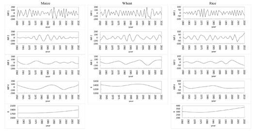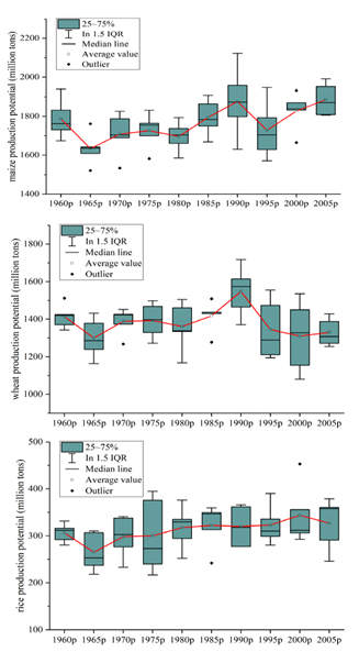 气候变化背景下的农作物生产潜力研究对充分利用土地和气候资源优化粮食生产具有重要意义。气候变化具有周期性波动和长期变化趋势两种特征,然而由此带来的农作物生产潜力周期性变化和长期趋势尚不清楚,影响不同农作物生产潜力的主要气候要素也有待深入挖掘。李飞副教授研究团队集成了全球农业生态区(GAEZ)模型和极点对称模态分解(ESMD)模型,探讨了1960-2010年间气候变化背景下中国三种主要农作物(小麦、水稻、玉米)的生产潜力变化趋势。研究发现,受气候变化影响三种作物生产潜力变化均具有准3年和准5年的周期。气候变化增加了玉米和大米的生产潜力,但降低了小麦的生产潜力。最低温度的升高是增加玉米和水稻生产潜力的主要原因,小麦生产潜力下降的主要原因是最高温度的升高。降水减少对三种农作物的生产潜力都产生了较大的负面影响。