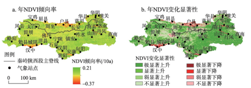 图.1 秦岭南北坡NDVI 倾向率及显著性空间分布