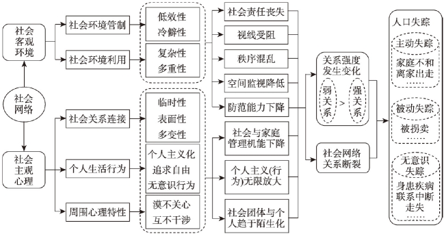 中国失踪人口形成机制:人口失踪可用社会网络理论中的“强弱连接理论”来解释,由于社会网络关系强度发生变化,甚至社会网络关系的断裂,导致人在社会网络的联系由熟人社会的“强关系”变为陌生的“弱关系”,从而使人处于“失踪”的状态。