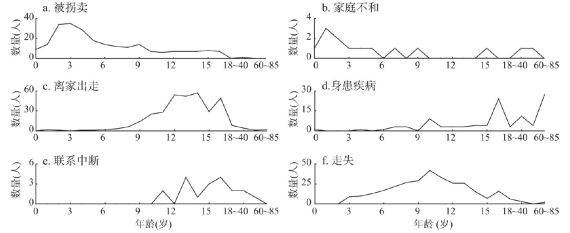 中国失踪人口的基本特征:人口失踪的高发年龄由高到低依次为8~16 岁、2~7岁、0~1 岁和60~65 岁,失踪人数男性多于女性。失踪类型由高到低依次为无意识失踪、主动失踪和被动失踪;失踪亚类由高到低依次为离家出走、走失、被拐卖、身患疾病、联系中断与家庭不和,且对应的高发年龄分别为7~17 岁、3~15 岁、2~9 岁、60~85 岁、13~40岁和18~59岁。