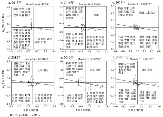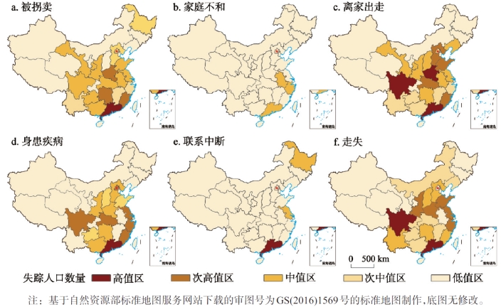 中国失踪人口的空间分布格局:失踪人口在省域上以“低—高”和“高—低”集聚为主,广东、浙江和四川是人口失踪的高发省份,新疆、辽宁、天津和吉林是人口失踪的低发省份。不同的失踪亚类在省域分布中存在显著差异,广东是各失踪亚类的高发省份。家中、村子里、小区附近、街道里巷、公司附近和家附近是人口失踪的高发微观空间。