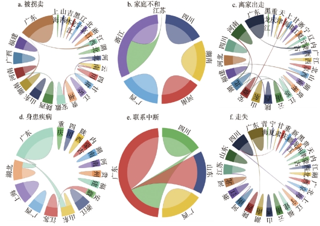 中国失踪人口失踪后找回占比与流动路径:找回占比由高到低依次为离家出走、走失、被拐卖、身患疾病、联系中断和家庭不和。失踪人口在失踪后滞留在本省的几率大于省外。省内流动以广东、四川、河南和江苏为最,跨省流动以“安徽—江苏”和“广西—广东”为主要路径,不同失踪亚类的流动路径也存在差异。