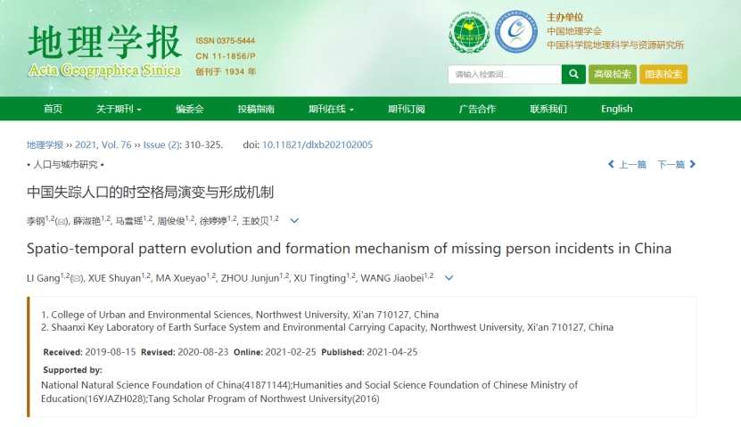 人口失踪作为一种复杂的社会问题,给家庭和社会造成了严重危害。在尊重生命与保障人权的现实背景下,对失踪人口开展深入研究具有重要意义。李钢教授带领其团队成员,从地理学的视角探讨整个失踪人口群体在不同时空尺度上的分布特征与规律,并解析中国失踪人口的形成机制,为科学精准预防人口失踪与及时找回失踪人口提供参考。该研究成果近期已在《地理学报》官网在线发表。