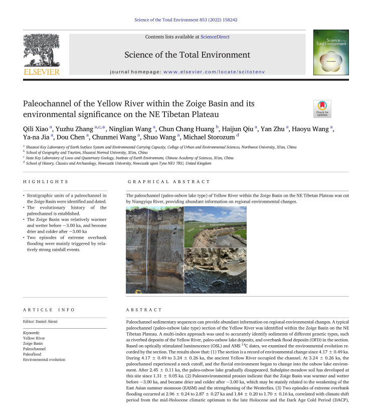该研究成果受第二次青藏高原综合科学考察研究项目 (2019QZKK0903)、国家自然科学基金项目 (42277449,41977062)、中国科公司 (A类) 战略性先导科技专项项目 (XDA20060201)、黄土与第四纪地质国家重点实验室开放基金项目(SKLLQG2107) 支持,已在《Science of the Total Environment》(中科院SCI Top期刊, IF=10.753) 在线发表。