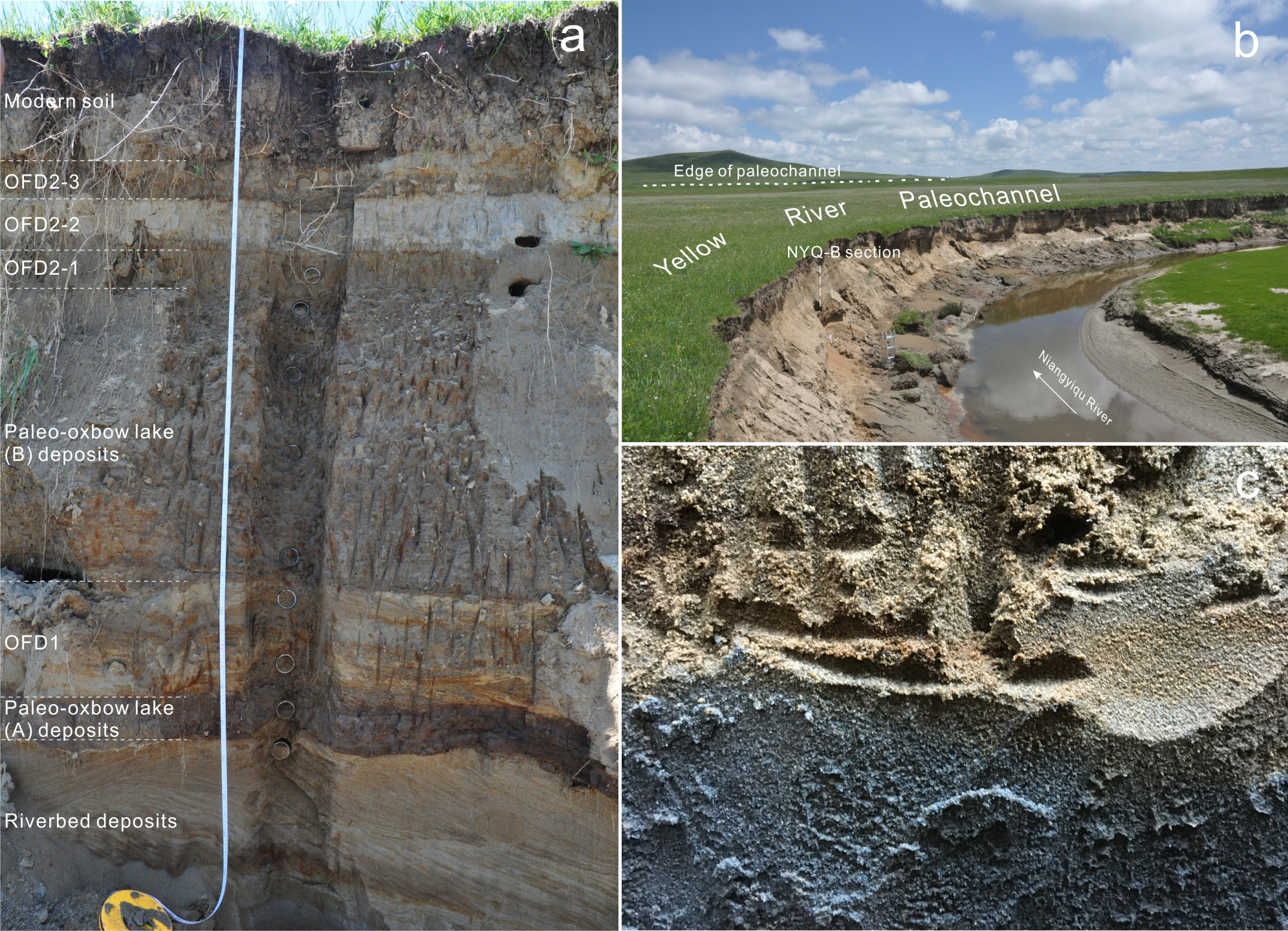 图2若尔盖盆地黄河牛轭湖古河道沉积剖面(NYQ-B)地层照片及其地层划分和牛轭湖古河道照片