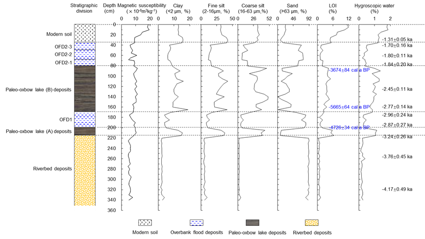 张玉柱副教授团队通过对黄河源若尔盖盆地河段开展广泛细致的野外考察,选择具有代表性的牛轭湖古河道沉积剖面 (NYQ-B) 进行系统采样。基于野外宏观特征和室内磁化率、粒度、烧失量等指标分析结果,准确鉴别出了若尔盖盆地黄河牛轭湖古河道沉积序列中赋存的古河床相沙层、古牛轭湖相沉积层以及古洪水泛滥沉积层等不同成因类型的沉积层,进而建立了其地层沉积序列。结合光释光(OSL)和AMS 14C测年结果,对该牛轭湖古河道沉积序列记录的环境演变信息进行了深入探究。研究结果表明:(1) 剖面记录了4.17±0.49 ka以来牛轭湖古河道的环境变化:在4.17±0.49 ka~3.24±0.26 ka期间,古黄河曾一度占据河道; 3.24±0.26 ka前后古黄河发生裁弯取直(颈口裁弯),古河道则被逐步废弃,河流环境开始向古牛轭湖环境转变;2.45±0.11 ka后古牛轭湖逐步走向消亡;1.31±0.05 ka以来该地开始发育亚高山草甸土,暗示牛轭湖古河道最终向草原景观演变;(2) 古环境代用指标表明,若尔盖地区在约3.00 ka之前气候较为温湿,而在约3.00 ka之后气候开始向干冷转变,这可能主要与东亚夏季风的衰弱和西风环流的增强有关;(3) 2期大洪水事件分别发生在2.92±0.22~2.87±0.27 ka和1.80±0.13~1.70±0.16 ka,在时间坐标上分别对应于全新世中期大暖期向晚期干旱时期的转折阶段以及黑暗时代冷期 (DACP)。这些特征时段由于气候相对寒冷干燥,青藏高原山地冰川普遍推进,冰雪融水的贡献可能较为有限,而气候转折和突变时期大气环流异常停滞、中低纬系统之间相互作用所引发的暴雨洪水,可能是导致这2期大洪水事件的主要原因。