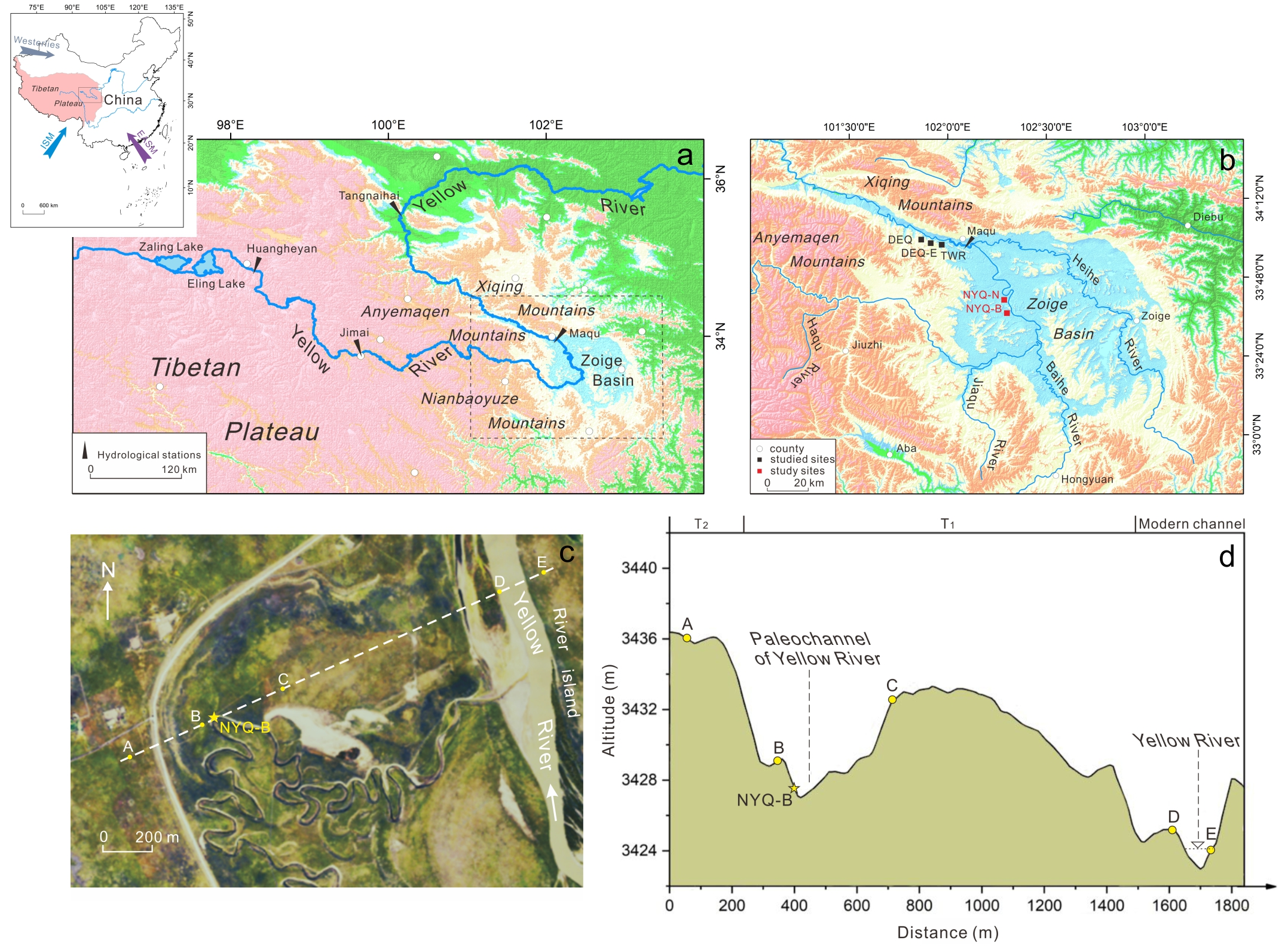 在青藏高原东北部,晚更新世若尔盖古湖消亡之后,黄河干流及其支流白河和黑河等流经盆地内部且蜿蜒曲折,在来水来沙、河岸侵蚀及泥沙输移沉积等自然因素的影响下,发生迁移改道形成了诸多牛轭湖古河道。这为研究青藏高原东北部黄河河道变迁以及环境演变过程提供了理想材料。然而,相关研究缺乏对牛轭湖古河道充填物沉积相的系统认识,没有充分考虑牛轭湖古河道所分布的河流阶地位置及其发育(河流阶段)和废弃(因裁弯取直形成牛轭湖)的绝对年代,从而无法对河道变迁历史进行准确复原及古环境重建。同时值得注意的是,牛轭湖古河道虽然已脱离河流阶段,但并没有完全摆脱河流系统作用的影响,其往往会成为河流洪水淹没和蓄洪的场所,使牛轭湖古河道沉积剖面赋存河流洪水事件的沉积层。