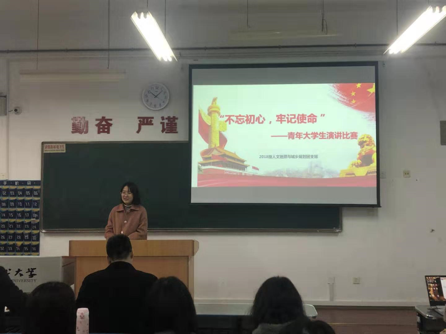 2018级人文地理与城乡规划团支部于2019年11月23日上午组织开展了“不忘初心、牢记使命”主题团日演讲活动。本次班级团日活动邀请了校团委邹阳笛和院团委李启超两位老师参加。