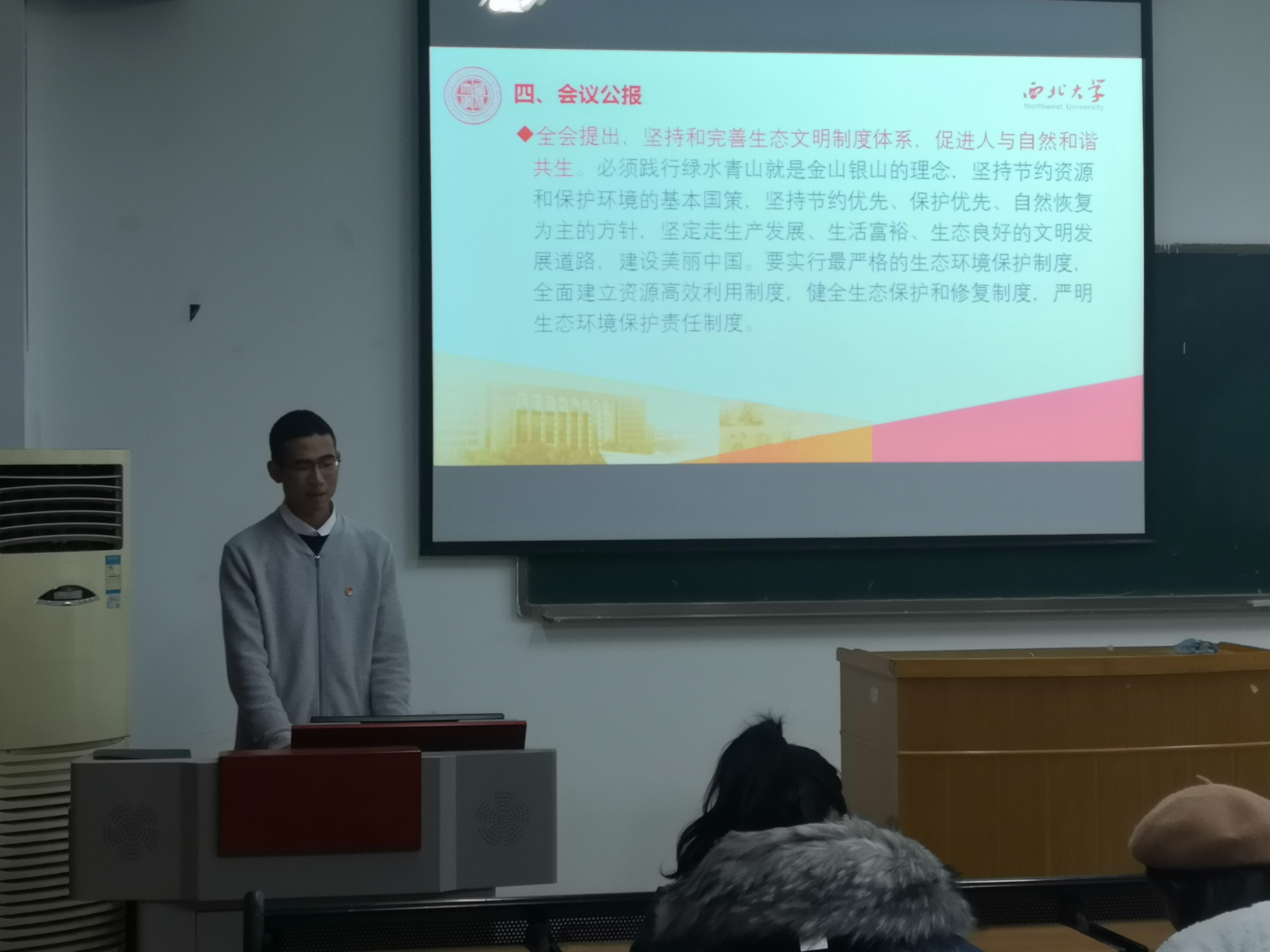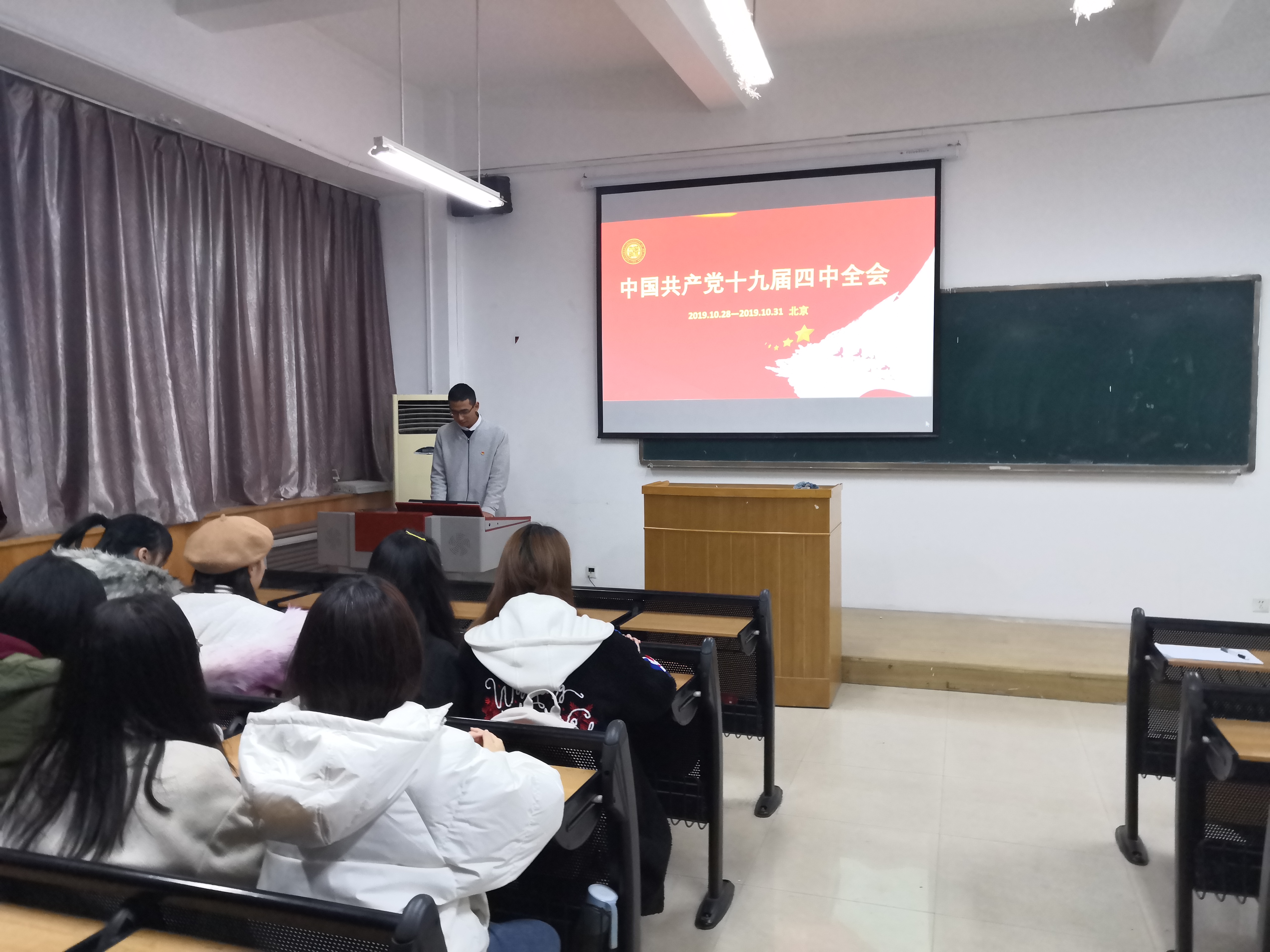 首先,姚岱钧同学为同学们介绍了中国共产党第十九届四中全会召开的背景和召开的意义,在他的讲解下,同学们了解了中国共产党中央委员会召开的历史意义和会议对当下中国的实际意义。
