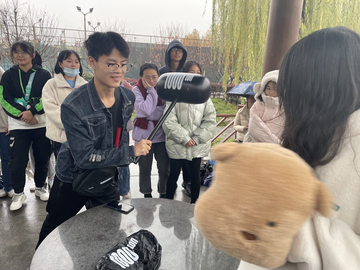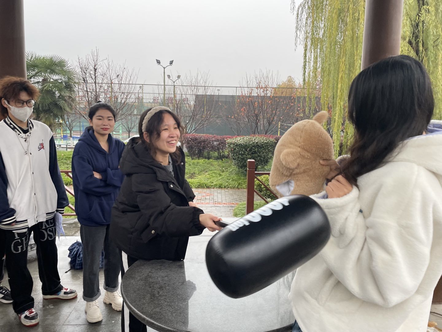 “攻防转换”更是欢乐多多,各队选手分别与工作人员对垒进行石头剪刀布,赢者用气锤敲打对方,败者需要用盾牌进行保护,若攻击方胜利,则记一分,直至十分即可通关。该项目在紧张刺激之余,释放了同学们在日常学习生活中感受到的部分压力,收获了快乐。