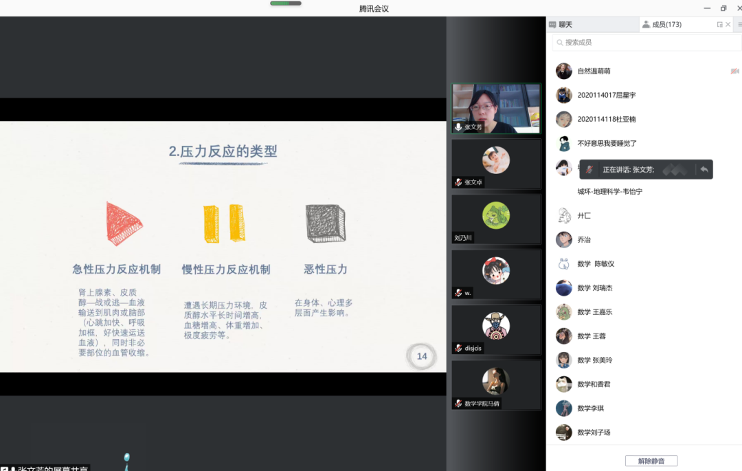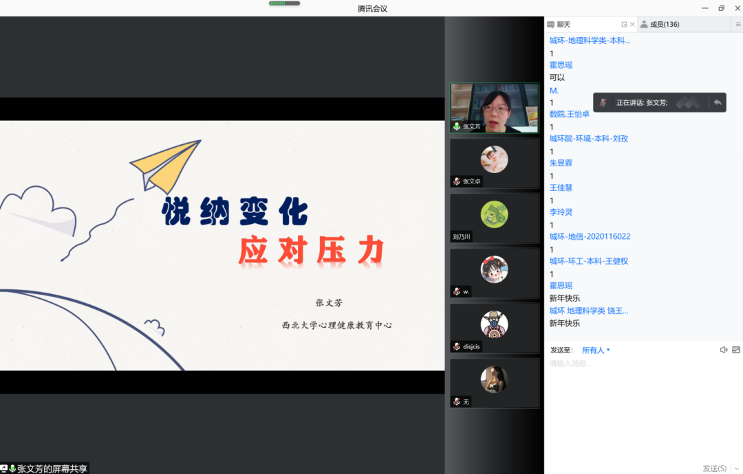 2021年末的疫情来得较为突然,自封闭管理已近大半个月,同学们多少有些不安和焦虑的情绪,为了帮助大家更合理得看待变化,更理性得应对压力、调适心理状态,以更加积极向上的状态面对封闭生活,公司联合数学公司邀请公司心理中心的张文芳老师,于2022年1月1日为大家带来主题为《悦纳变化 应对压力》的心理健康讲座。