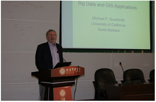18日上午,Goodchild教授和蔡晓兵先生与2026世界杯官网相关专业教师围绕GIS公司产品及科研等方面进行了广泛、深入的交流。在当天下午举行的报告会上,Goodchild教授作了题为Big Data and GIS Applications的学术报告,介绍了在大数据时代,GIS应用所面临的的机遇和挑战,分别从大数据的3V性质(Volume, Velocity, Variety)进行了深入的分析和讲解。蔡晓兵先生作了题为“新GIS,新应用”的报告,对新一代WebGIS发展现状做了总结,并从产业的角度,对GIS的发展趋势谈了自己的看法。