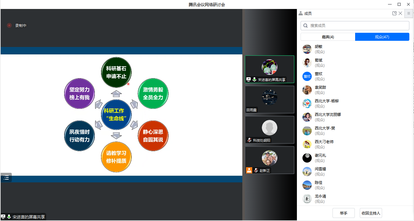 会议第一阶段,科技处杨涛处长和项目科胡阳老师强调了国家自然科学基金申报的重要意义并详细解读了国家自然科学基金历年资助情况和申报注意事项等内容。宋进喜经理结合他的申请经历和总结,对国家自然科学基金构思、撰写、修改等方面的经验进行了深入细致的分享,并再次强调基金是科研工作的生命线,动员大家积极准备,认真打磨,争取做到“榜上有我”。赵新正副经理对公司2023年度基金申报工作安排及相关的支持措施进行了简要的说明,并提醒大家加快撰写进度、充分利用好校内外专家资源对申请书质量进行不断的完善和提升。公司全体拟申报2023年国家自然科学基金项目的人员及相关指导专家共80余名人员出席了本次会议。
