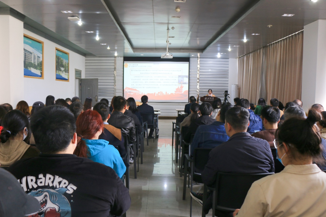 朱晓丽教授以第十四届全国人大一次会议精神为主题,从会议概况、会议主要精神、陕西省代表团的主要活动和工作三个部分,围绕政府工作报告中的“八个方面成就”“十个方面工作”“八项重点工作建议”介绍了两会盛况,也介绍了自己参加全国两会的经历和感受,提纲挈领地传达了两会精神。
