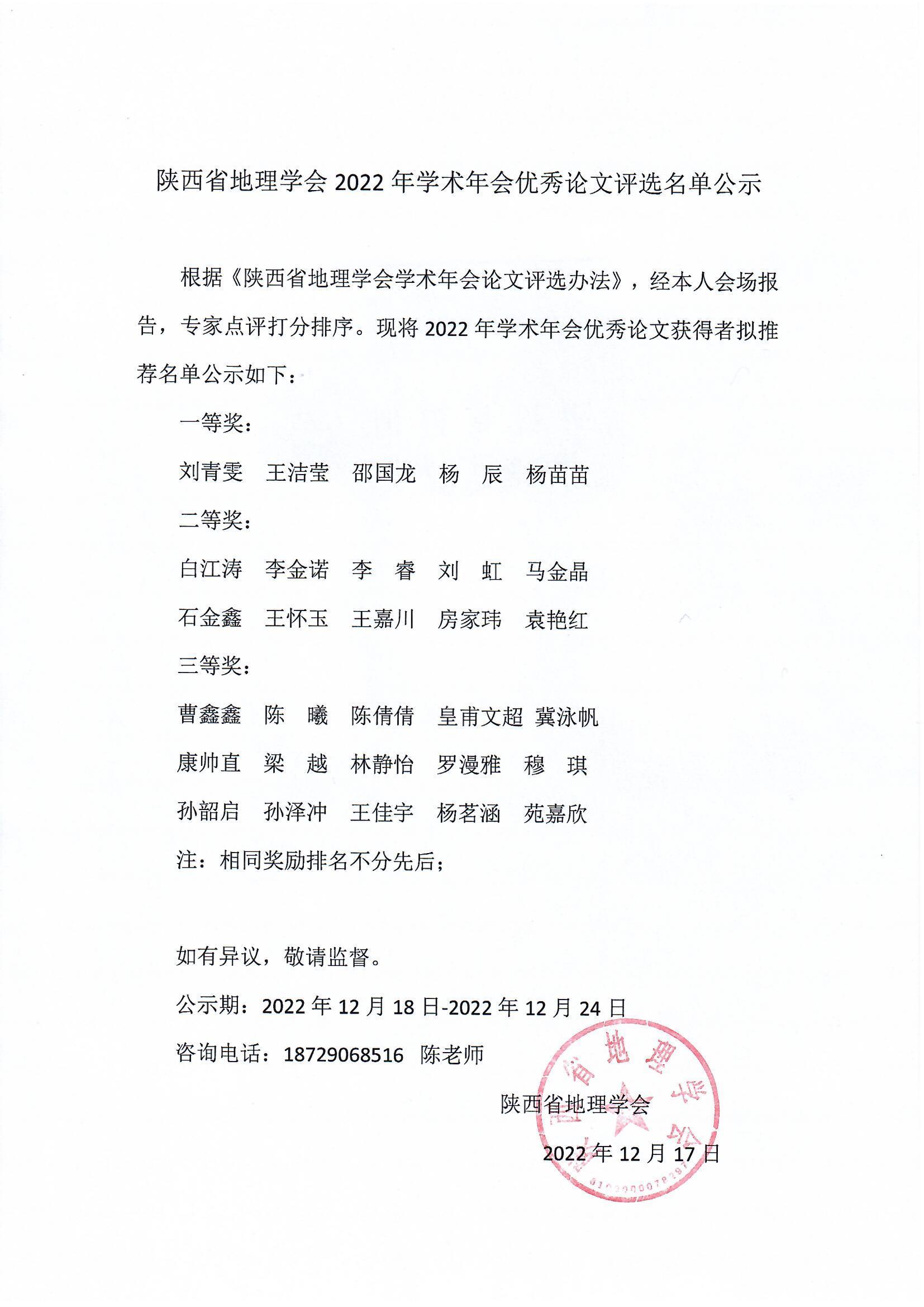 陕西省地理学会2022年学术年会优秀论文评选名单公示