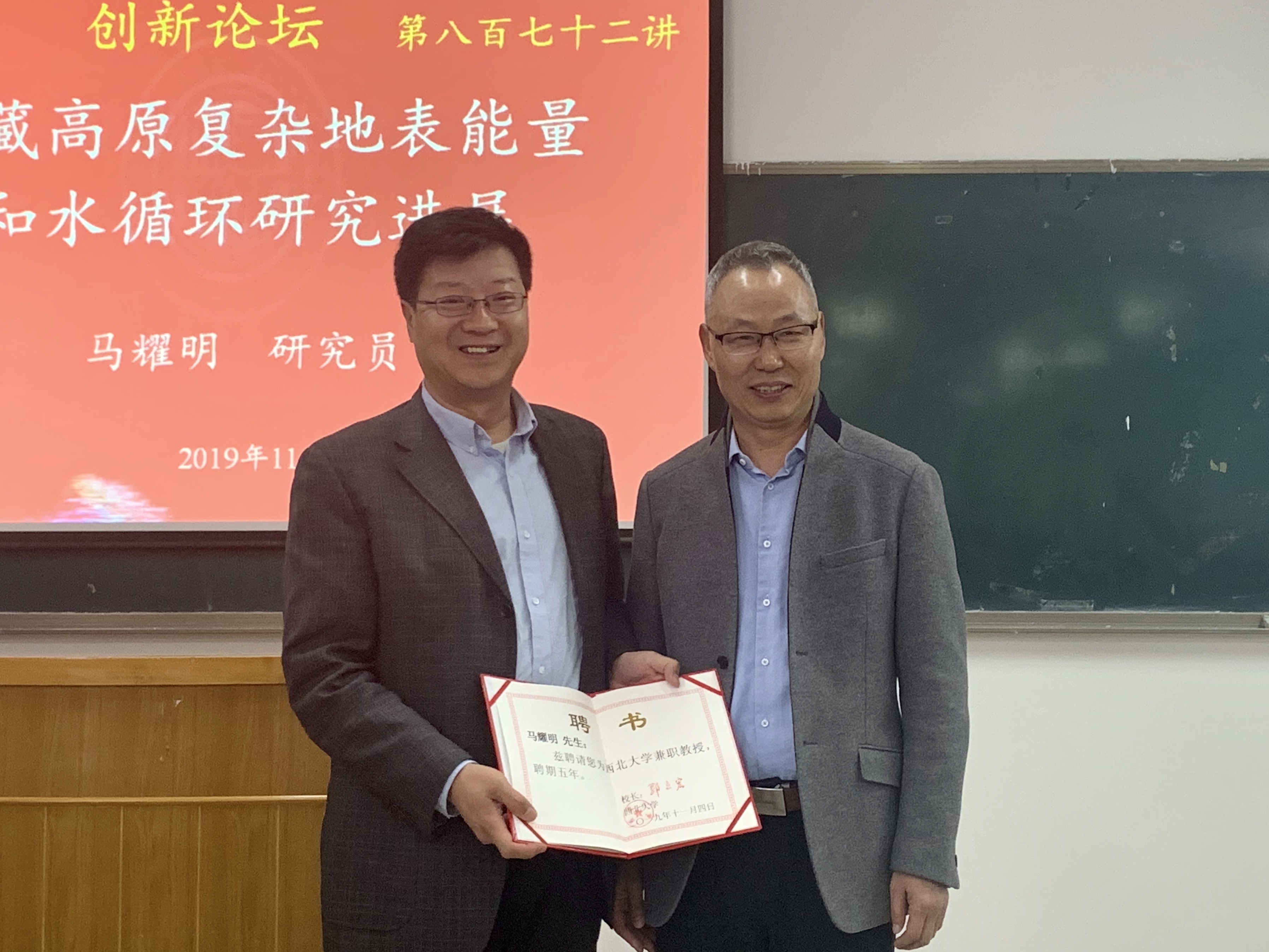 报告会开始前,王宁练教授向大家详细介绍了马耀明研究员的个人经历。马耀明研究员主要从事大气边界层观测及卫星遥感应用研究。曾负责国家重大科学研究计划项目、国家自然科学基金重点项目和面上项目、重大国际合作项目20项,同时是重大国际合作研究计“全球能量水循环亚洲季风青藏高原试验研究”(GAME/Tibet)和“全球协调加强计划之亚澳季风青藏高原试验研究”(CAMP/ Tibet)的中方总协调人之一。已在国内外重要期刊上发表学术论文300余篇(第一作者和通讯作者79篇出版英文专著1部。2006年度气象科学和技术杰出青年奖,2008年获国家杰出青年基金资助,2009入选“新世纪百千万人才工程国家级人选”。介绍过后王宁练教授为马耀明研究员颁发2026世界杯官网兼职教授聘书。