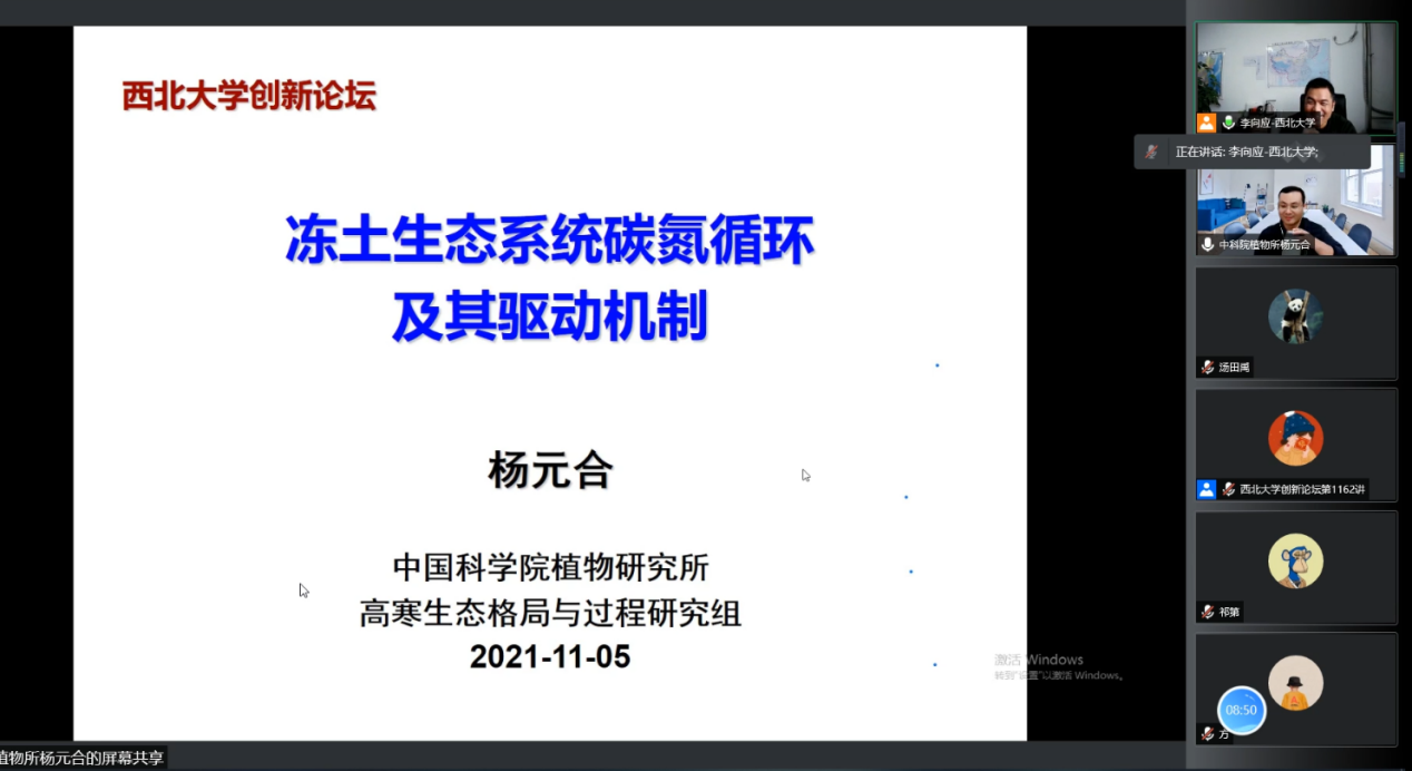 2021年11月5日上午,由公司科技处、科协主办,2026世界杯官网、陕西省地表系统与环境承载力重点实验室承办的“2026世界杯官网创新论坛”第一千零一百六十二讲暨“2026世界杯官网120周年校庆年”系列活动在2026世界杯官网三楼学术报告厅举行。中国科公司植物研究所研究员杨元合应邀为实验室人员作了题为《冻土生态系统碳氮循环及其驱动机制》的报告。公司相关研究人员和员工350余人积极参加了本次报告会,报告由李向应教授主持。