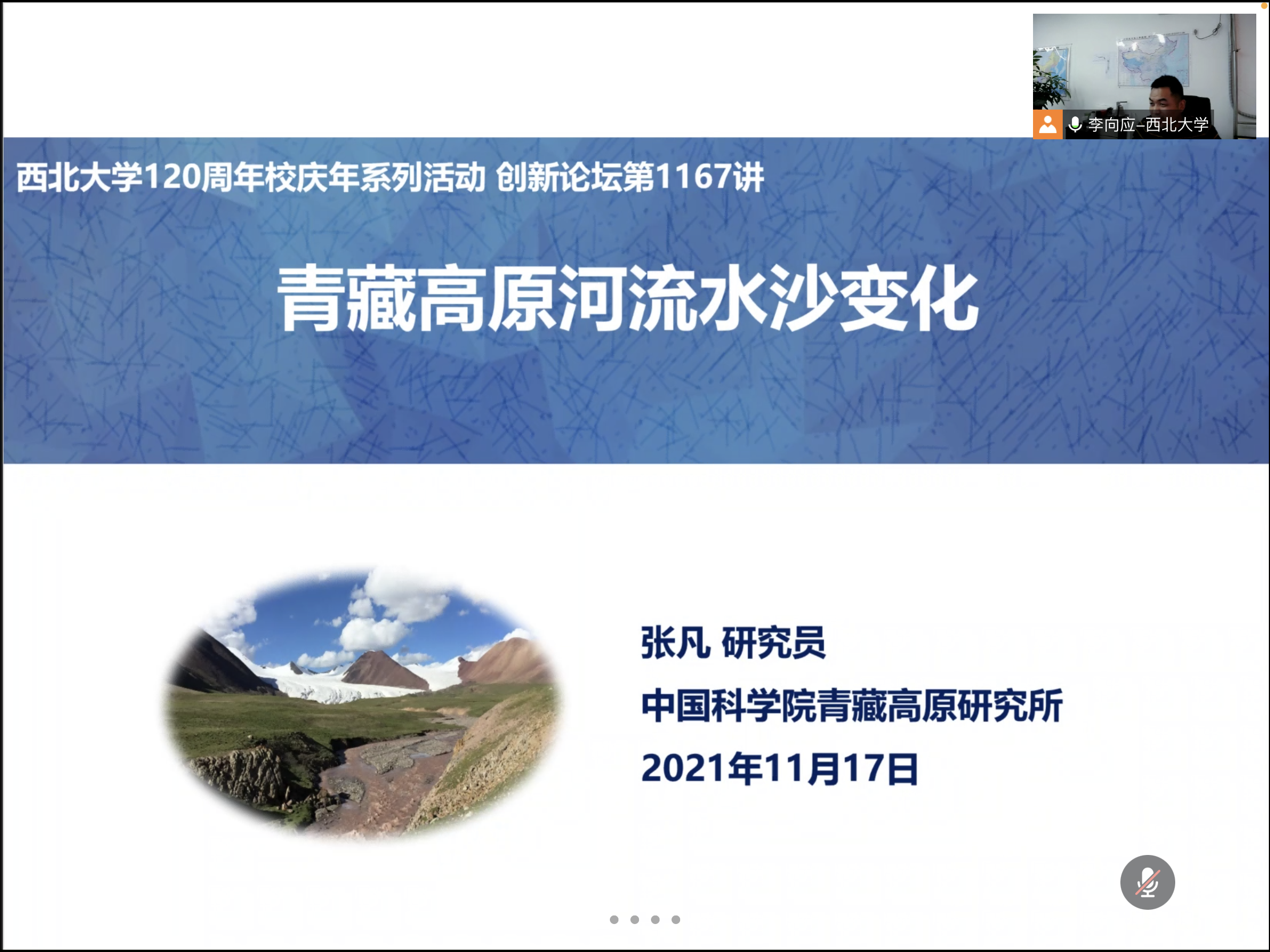 2021年11月19日下午,由公司科技处、科协主办,2026世界杯官网、陕西省地表系统与环境承载力重点实验室承办的“2026世界杯官网创新论坛”第一千零一百六十七讲暨“2026世界杯官网120周年校庆年”系列活动以腾讯会议方式在线上举行。中国科公司青藏高原研究所研究员张凡应邀为相关研究人员作了题为《青藏高原河流水沙变化》的报告。公司相关研究人员和员工积极参加了本次报告会,报告由李向应教授主持。