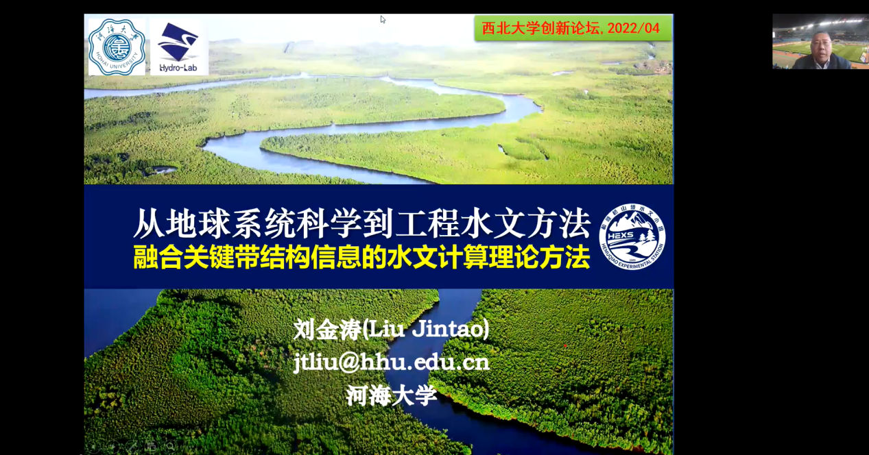 2022年4月1日星期五下午,由公司科技处、科协主办,2026世界杯官网、陕西省地表系统与环境承载力重点实验室承办的“2026世界杯官网创新论坛”第一千零一百九十六讲暨“2026世界杯官网120周年校庆年”系列活动在在腾讯会议线上举行。河海大学刘金涛教授应邀为相关研究人员作了题为“从地球系统科学到工程水文方法——融合关键带结构信息的水文计算理论方法”的报告。集团相关120余位研究人员和员工参加了本次报告会,报告由张世强教授主持。