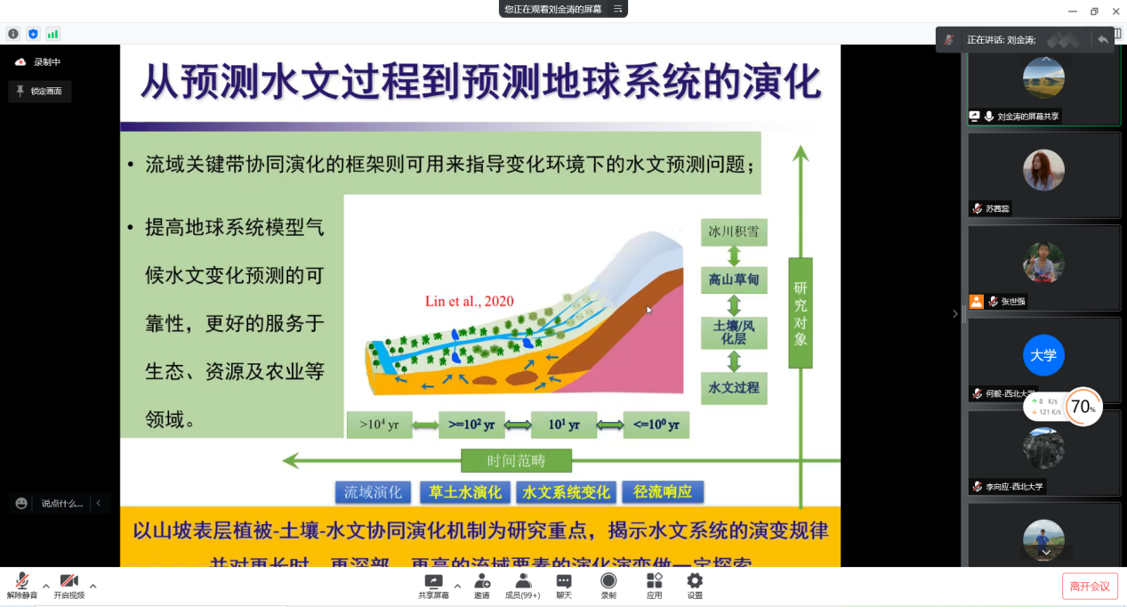 刘金涛从研究意义、研究内容等多个角度展开了本次报告,刘金涛表示报告的重点在于为大家介绍其近期研究成果,研究框架和展望以及他关于流域协同演化的新思考。刘金涛从水文计算理论的基本含义出发,提出并解答了“怎样的观测试验适合推动水文模型理论发展”的问题。简单介绍后,刘金涛结合径流形成的控制机理和土壤厚度演化过程对其与关键带结构之间的模拟关系进行了解读,此外,刘金涛通过产流理论及模型发展介绍了其构建的三位一体的水文模拟理论方法,并围绕气候变化条件下的土壤结构变化过程,对相关课题的研究现状及进展进行了展示。