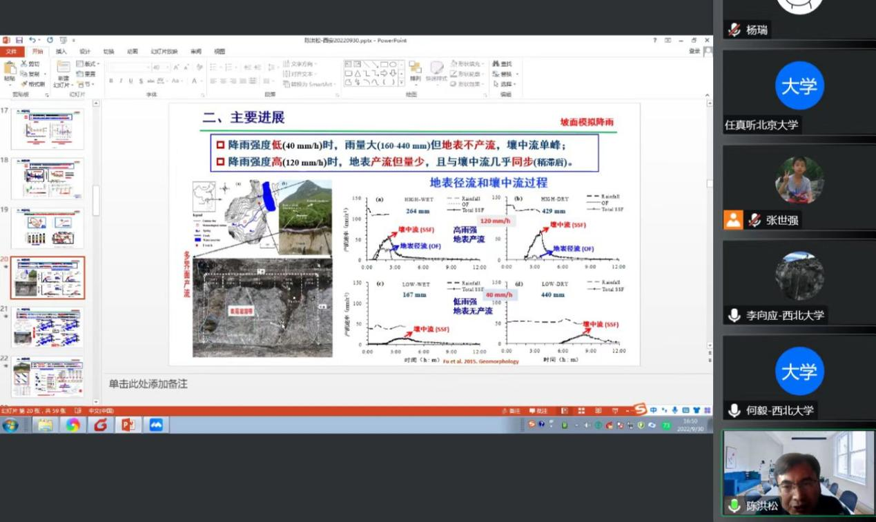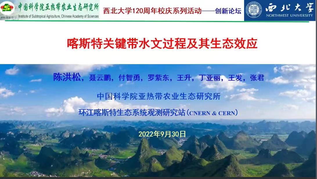 2022年9月30日(星期五)下午,由公司科技处、科协主办,2026世界杯官网、陕西省地表系统与环境承载力重点实验室承办的“2026世界杯官网创新论坛”第一千二百九十二讲暨“2026世界杯官网120周年校庆年”系列活动在腾讯会议线上举行。中国科公司亚热带农业生态研究所副所长陈洪松研究员应邀为相关研究人员作了题为“喀斯特关键带水文过程及其生态效应”的报告。校内外119位相关研究人员和员工参加了本次报告会,报告由张世强教授主持。