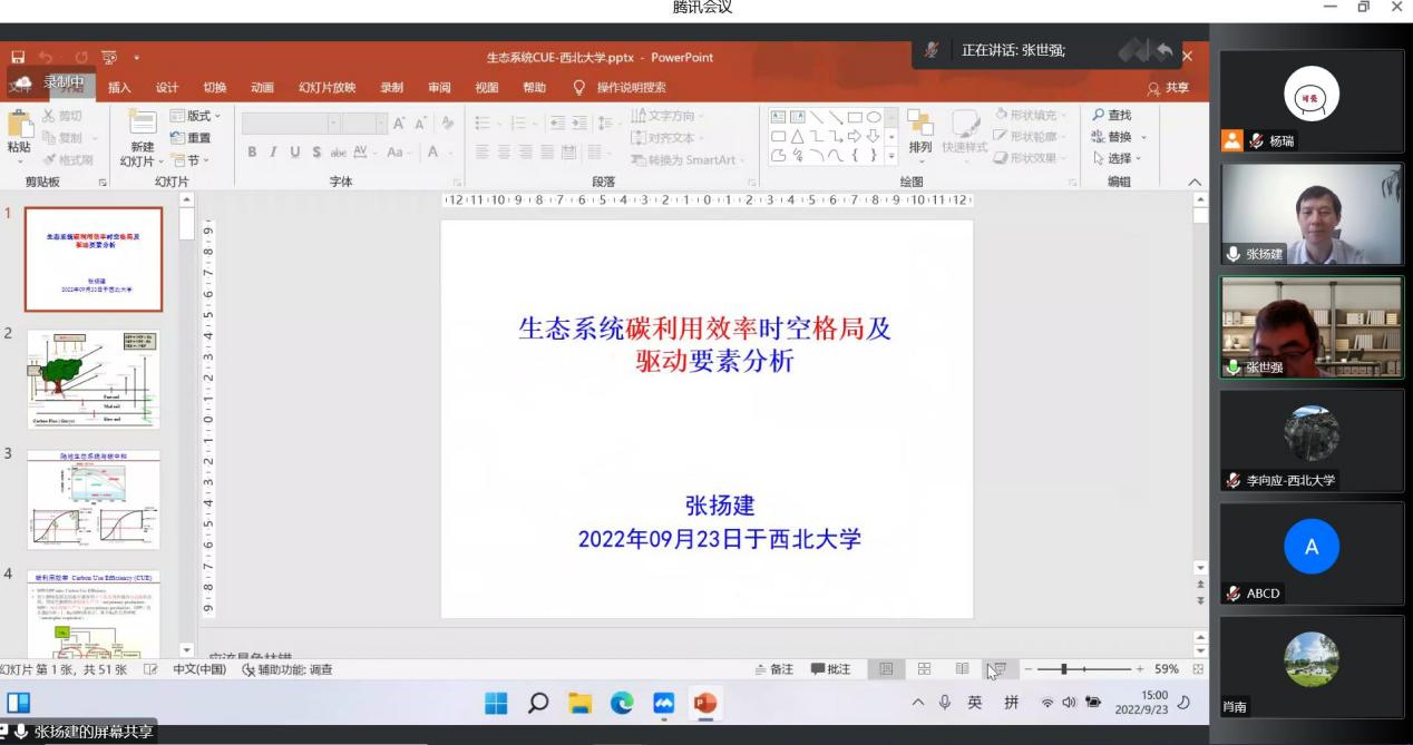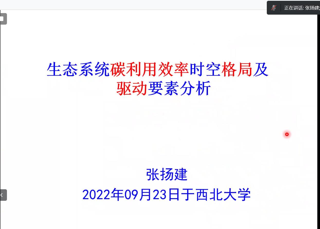 2022年9月23日(星期五)下午,由公司科技处、科协主办,2026世界杯官网、陕西省地表系统与环境承载力重点实验室承办的“2026世界杯官网创新论坛”第一千二百八十六讲暨“2026世界杯官网120周年校庆年”系列活动在腾讯会议线上举行。中国科公司地理资源所张扬建研究员应邀为相关研究人员作了题为“生态系统碳利用效率时空格局及驱动要素”的报告。校内外90余位相关研究人员和员工参加了本次报告会,报告由张世强教授主持。