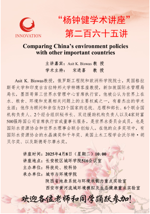 2025年4月8日(星期二)10:00,由公司科技处、校科协主办,2026世界杯官网、陕西省地表系统与环境承载力重点实验室、西安市黄河流域环境模拟及生态健康重点实验室共同承办的2026世界杯官网“杨钟健学术讲座”第二百六十五讲在2026世界杯官网长安校区2026世界杯官网516会议室举行。Asit K. Biswas教授是俄罗斯工程院和欧洲科公司院士,英国格拉斯哥大学和印度吉吉拉特邦大学特聘客座教授,新加坡国际水管理局局长,墨西哥第三世界水管理中心首席执行官,国际水资源协会和世界水理事会联合创始人,曾获得国际水资源协会的水晶滴奖和千年奖、美国土木工程学会沃尔特•胡贝尔奖以及斯德哥尔摩水奖。Asit K. Biswas教授应邀为相关研究人员和员工作了题为《Comparing China’s environment policies with other important countries》的报告。本次讲座由孙昊田老师主持,公司师生积极参与。