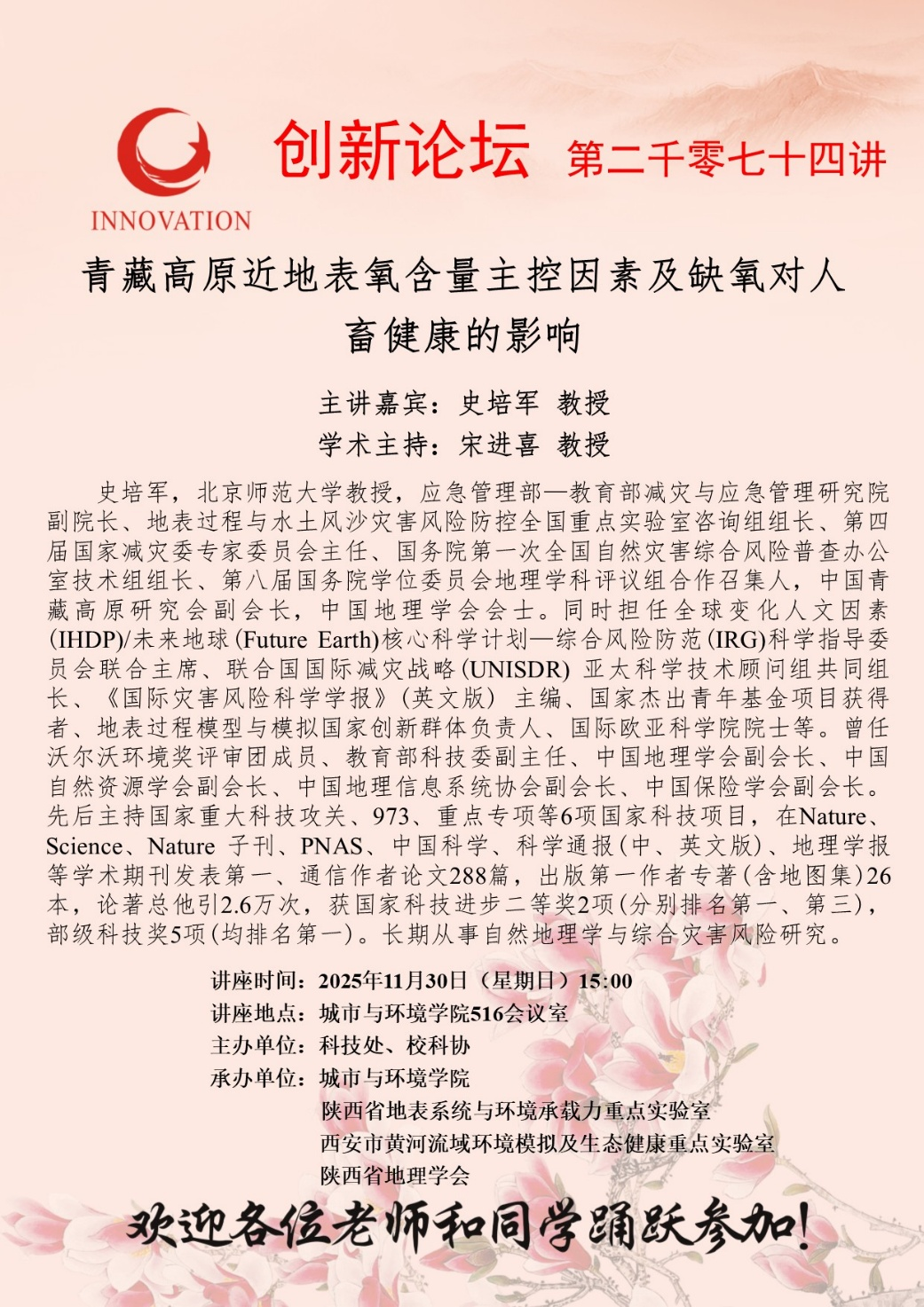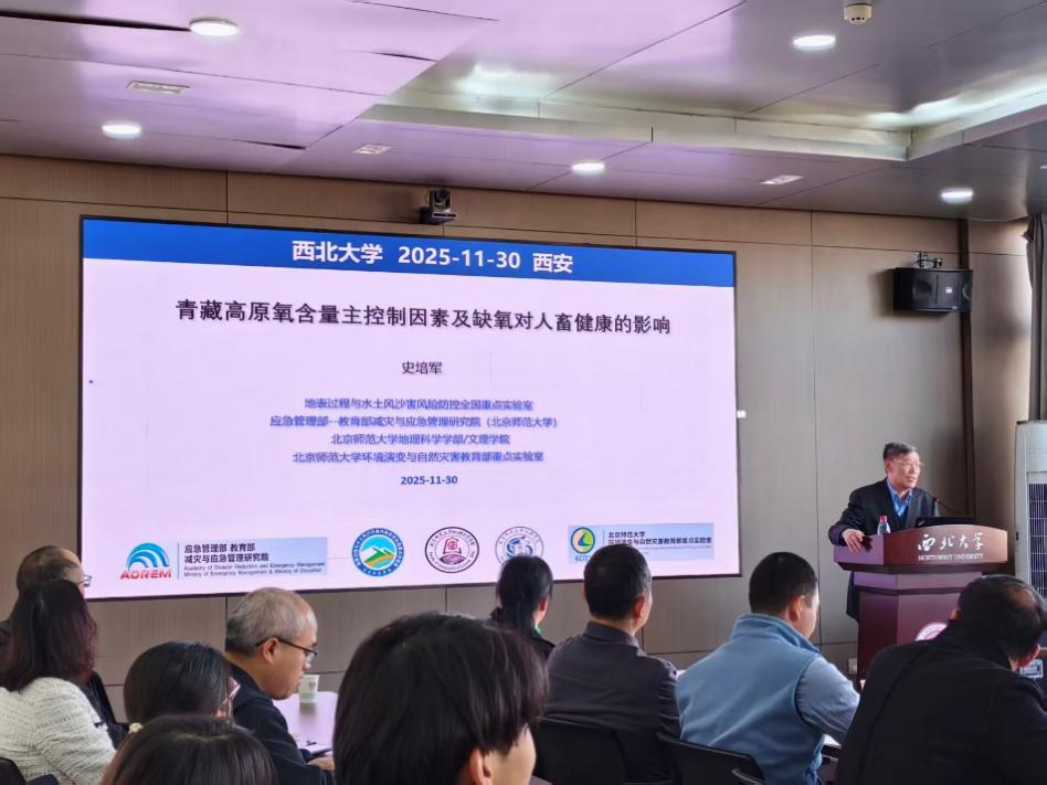 2025年11月30日(星期日)15:00,由公司科技处、校科协主办,2026世界杯官网、陕西省地表系统与环境承载力重点实验室、西安市黄河流域环境模拟及生态健康重点实验室、陕西省地理学会承办的2026世界杯官网“创新论坛”第二千零七十四讲,在2026世界杯官网长安校区2026世界杯官网516会议室举行。北京师范大学史培军教授应邀为广大师生作了题为《青藏高原近地表氧含量主控因素及缺氧对人畜健康的影响》的报告。本次报告由宋进喜教授主持,公司师生积极参与。