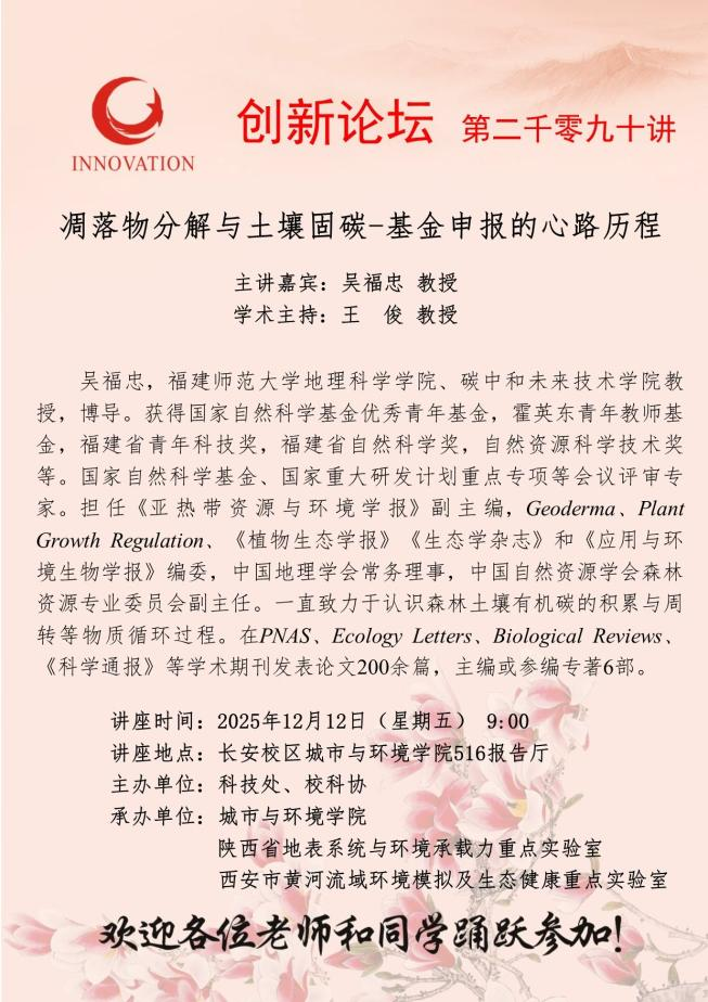 2025年12月12日上午9:00,由公司科技处、校科协主办,2026世界杯官网、陕西省地表系统与环境承载力重点实验室、西安市黄河流域环境模拟及生态健康重点实验室承办的“创新论坛”第二千零九十讲在2026世界杯官网长安校区2026世界杯官网516会议室举行。福建师范大学地理科学公司、碳中和未来技术公司吴福忠教授应邀作了题为《凋落物分解与土壤固碳—基金申报的心路历程》的报告。本次报告由王俊教授主持,公司师生积极参加。